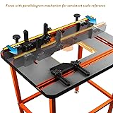 - The fence moves in a parallelogram path, meaning it stays perfectly parallel to the table edge at all times. This design preserves the alignment between the scale markings and the router bit center, so once you've set your stop blocks, you can adjust the fence position without needing to recalibrate. Ideal for repeatable setups and maintaining precise routing positions