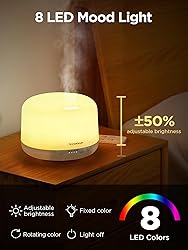 Extended 16.5ft Remote Control Reach: Control the Prime essential oil diffuser effortlessly from up to 16.5ft away with the included remote, letting you fine-tune mist and light settings without leaving your comfortable bed or sofa. Prolonged Aromatherapy and Humidification: With a capacious 500ml and easy-to-clean water tank, the InnoGear oil diffuser can run for up to 18 hours (9-12h for strong mist and 16-18h for weak) without the need for mid-session refills, to elevate your sensory experience from the moment you wake for the day to the last few minutes before you drift off to sleep at night. Multiple Mist Modes: The aromatherapy diffuser is selectable to run in continuous or intermittent mode (releases mist every 10 seconds), strong or weak mode, and is adjustable with the humidifier timers (1H/2H/3H) to suit your preferences and create the perfect ambiance. Powerful Upwards Mist Flow: Thanks to advanced ultrasonic technology, the diffuser delivers a potent upward mist flow—three times stronger than ordinary diffusers. Efficiently humidify the air without affecting your furniture, ensuring uniform atomization of essential oils. Diverse Ambient Night Light: Diffuser offers 8 colors of ambient light mode, each with two intensity settings (50% brightness or full brightness), which allows you to enhance a soothing atmosphere with a choice of 16 different light combinations. You can set the light through a rainbow of colors or fix it on a single color of choice. The light can be turned on or off independently.