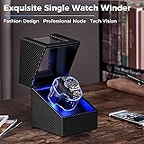 - Our automatic watch winding boxes are designed for the discerning collector. This single watch winding case features a new generation of illuminated clear watch cups for display of your watch. The beveled design is wrapped in premium carbon fiber leather and lined with ultra-soft, high-resilience memory foam padding to provide protection for your watch winding case or other automatic watch. Our watch winder boxes are equipped with an ultra-quiet motor (<5 dB), good for the bedroom or office. Specification: Product: 4.72 inches wide x 5.04 inches deep x 6.22 inches high | Weight: 3.31 pounds Package: 7.09 inches wide x 6.30 inches deep x 8.66 inches high | Weight: 4.63 pounds Special Note: The watch winder can be powered by AC power or AA batteries, but not both!
