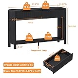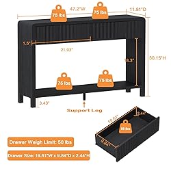 [Console Table with 2 Drawers] This wood entryway table features minimalist lines and smooth rounded edges, complemented by two unique drawers with a distinctive waveform panel showcasing beautiful natural wood grain. It is a standout piece that enhances the ambiance of any room. The sleek curved profile ensures security for children and families [Ample Storage Space] Featuring 2 long shelves and 2 drawers, this contemporary-inspired sofa table provides ample storage and display options. Show off your favorite books and multi-height decor on the spacious shelves, while the drawers provide a hidden storage solution for small items. Whether placed in your hallway or behind sofa, this foyer table adds a touch of modern charm and to your home while keeping clutter out of sight [Stable Structure & High Weight Capacity] With a chunky tabletop, a sturdy bottom shelf, this hallway table boasts impressive weight capacity. The wood top and bottom shelf can hold up to 150 lbs respectively, while the drawer can support up to 50 lbs [Dimension & Materials]: This entry table measures 47.20" W x 11.81" D x 30.15" H. Crafted from high-grade MDF, supported by 1.5-inch heavy chunky wood leg frames and a support leg under the bottom shelf, it ensures exceptional longevity. The black color beautifully combines natural and modern aesthetics. This entrance table is made of FSC-certified wood [Easy Assembly] This long sofa console way table takes around 40 minutes to assemble. Includes clear, detailed instructions and all necessary accessories, including anti-tip fittings. Each component is numbered for quick and efficient assembly