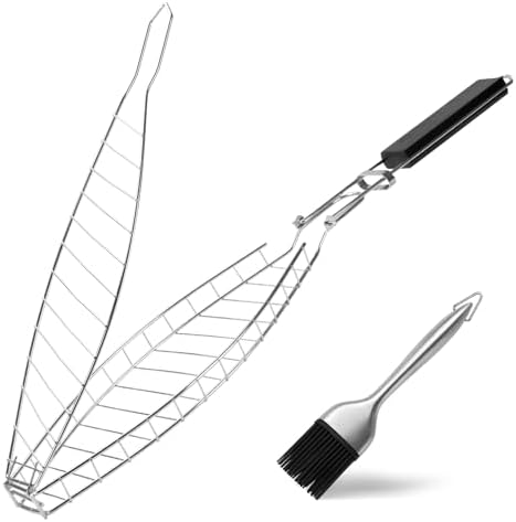 Fish Grill Basket, Large Fish Grilling Rack for Grill Fish Vegetables Shrimp, Folding Stainless Steel Grill Basket with Removable Wooden Handle & Basting Brush