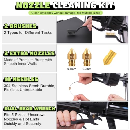 - 【3D Printer Tools Expedite Your Workflow, 1-Year Warranty】Designed and Selected by a 15-Year 3D print enthusiasts team, this kit includes all essential tools. We have MK8 Brass Nozzles x 2, Nozzles Cleaning Needles × 5, Brushes × 2, Small Multifunctional Wrench x 1, 45# Steel Removal Scraper x 1, Razor Spatula x 1 plus Blades x 11, Files x 5, Engraving Knife x 1 plus Blades x 6, Tweezers x 2, Wire Cutter x 1, ensuring a successful 3D model-building experience. Pro tools, better price.