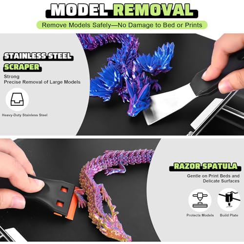 - 【2 Types of Removal Scrapers for Flawless Prints】To remove different-sized prints without damaging the print bed, the kit includes 2 types of removal scrapers. One scraper features a Heavy Duty Stainless Steel Blade for maximum leverage and fast removal, perfect for medium to large models like 3D printed dragons, ideal for PETG, ABS, PLA+. The smaller scraper with 10 extra-thin flat blades offers pinpoint accuracy, making it perfect for removing small models with precision like 3D printed toys.