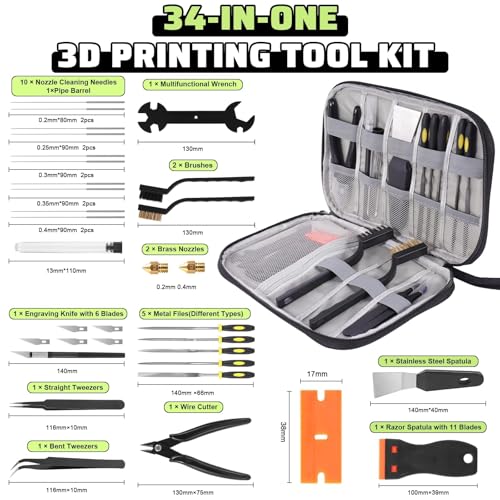 3D Printer Tools Kit, 34pcs 3D Printer Accessories for All FDM/SLA Printers Includes Nozzle Cleaning Tools, Removal Scrapers, Finishing Tools, 5 Types of Files,Brushes, Wire Cutter, Engraving Knife