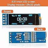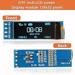 Size: 0.91 inches, Resolution: 128 x 32;Viewing angle:>160°;Supported voltage: 3.3V-5V DC,no need for level conversion chips;Power consumption during normal operation: 0.06W;Full screen illumination: 0.08W Compatible with Arduino nano, R3 board, Raspberry Pi 4B/3B+/3B/2B/Zero,ESP8266, ESP32, STM32, etc. No backlight required, each pixel emits light independently. It has ultra-high contrast, high resolution, bright and clear dots, making it easy to read even in small fonts Graphics and text information can be directly displayed on microcontroller projects, and OLED controllers do not have embedded fonts. Users can create fonts through font generation software Come with 20 DuPont wires (10 male-female and 10 female) to Help you use it more conveniently and quickly