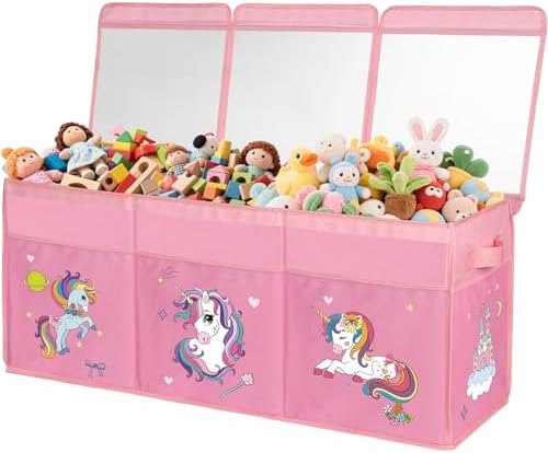 • 155 L Extra Large Toy Box Chest with Lid 3 Compartments Organizer: Unfoldable size is 42X16X14 Inch, which is large enough to hold various kinds of books,magazines,clothes towel basket,blankets.This toy box for girls is especially suitable for families with many different toys and dolls