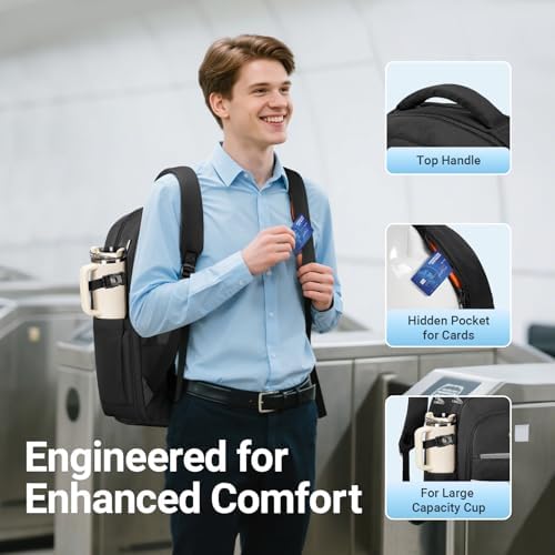 • Design for Large Capacity Cup: Work backpack for women with Adjustable elastic strap, designed for convenience, custom-designed for large capacity cups. Backpack with large water bottle pocket has separate laptop compartment for 13-15.6 inch laptop. Travel backpack with 2 easy-access front pockets is perfect for pens, mouse, also with reflective safety strips for nighttime visibility. The insulated side pocket keeps drinks warm or cool, perfect for coffee during commutes
