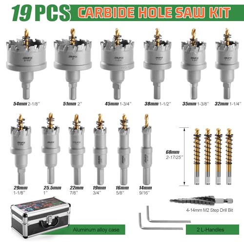 - Complete Drilling & Cutting Tool Kit: 12pcs of sizes metal hole saw drill bit 14 mm(9/16”), 16mm(5/8”), 19mm(3/4”), 22mm(7/8”), 25.5mm(1”), 29mm(1-1/8”), 32mm(1-1/4”), 35mm(1-3/8”), 38mm(1-1/2”), 45mm(1-3/4”), 51mm(2”), 54mm(2-1/8”), M2 HSS step drill (4-14mm), 4pcs M2 titanium plated pilot center drill, 2pcs L-shaped wrenches, black aluminum box