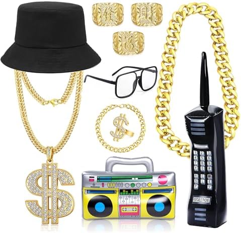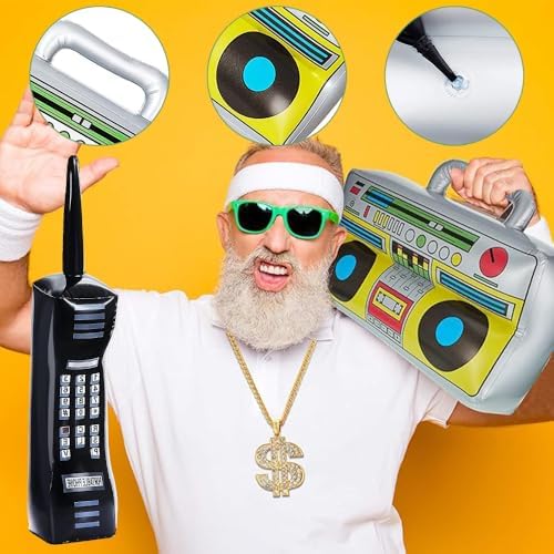 MOZAKA 80s 90s Hip Hop Costume Kit Inflatable Mobile Phone Radio box Ring Glasses Hat Rapper Costumes Accessories Set