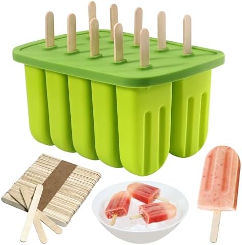 - 10 Cavity Popsicles Molds: The green popsicle mold set includes 1pcs 10-cavity mould and 50pcs wooden sticks. Ice cream molds sufficient quantity for your daily needs, and you can make ten different flavours perfect ice cream at once.Our ice mould is best choice for hot summers.