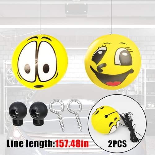 Car Garage Parking Aids Ball, 2PCS PU Vehicle Guide System Assist Ball Stopper with Cord Lock & Screw Hook, Retractable Auto Assistant Ball, Universal for SUV Sedan Truck (Big Eyes+Smiley Face)