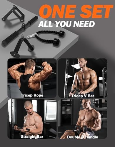 - All-in-One Combo: Includes V bar, double D handle, tricep rope, and straight bar, perfect for triceps, biceps, back, and shoulders; Supports a wide range of cable machine exercises for full upper body training