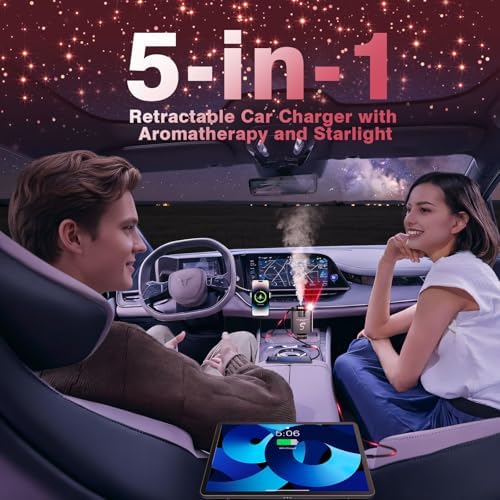 - [5-in-1 Charging + Aromatherapy Luxury] – Charge up to 3 devices via built-in cables (Type-C + Lightning) and USB-C ports (5V/2.4A-3A), Car Charger comes with a perfume atomizer, three bottles of essential oils with different fragrances, and additional red starlight ambiance light adds a touch of style to night driving, instantly transforming your car into an exclusive space that feels either romantically cozy or soothingly relaxing.