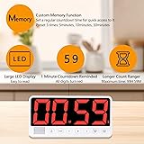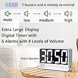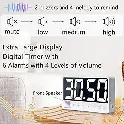 - FCXJTU EXTRA LARGE LED DISPLAY DIGITAL KITCHEN TIMER [ 2025 UPGRADED VERSION ] Ultra Clear LED display: Tired of using those small LCD timers? This FCXJTU digital timer is simple enough to read with 7.1 inches extra large display, 2.52in tall big numbers come with automatic off function, so you could easily read it even across a room. FCXJTU 99H 59M Digital Timer with 6 Alarms 4 Volume Levels This FCXJTU led kitchen timer is counting down from 99 hours 59 minutes to zero, or as a stopwatch count up from 0 to 99H:59M. The time has two modes. You could set 59 Minutes 59 Seconds countdown or 99 Hours 59 Minutes countdown. And the digits would change to red color when the countdown time is less than 1 minute. So you could be well prepared. 4 Levels of Volume Adjustable The led timer comes with 6 different alarms for you to choose from (2 Beep & 4 Music Alarms); 4 volume levels : Loud (80-95dB), Medium (70-85dB), Soft (60-75dB) and Mute, ideal for chef, teachers, students, kids, seniors and other people Memory Function The digital countdown timer has 3 sets of commonly used memory times, default time: 5 minutes, 10 minutes, 30 minutes, can be freely set memory time Rechargeable LED Timer Powered by 2000mAh lithium battery, charged with TYPE-C cable, takes about 3 hours to fully charge, and can last for about 18 hours of uninterrupted use. NOTE: PLEASE USE A 5V (OUTPUT VOLTAGE) POWER PLUG TO CHARGE IT. POWER PLUG HIGHER THAN 5V MAY LEAD TO BATTERY DAMAGE Automatic Power-saving Function This led timer has on/ off and automatic off function. In order to minimize power consumption during use, the power will automatically turn off when the timer is not in use for more than 3 minutes. Super Easy to Use with Large Buttons Power ON/OFF Volume button, Sound button, Separate HOUR, MIN and SEC button to set the exact time you need, the START/STOP button to start/pause, a RESET/MEMORY button is added to makes it much easier to reset. Place The Timer Wherever You Need: The digital kitchen timer for cooking with 4 strong built-in magnets for a powerful suction and no slip, easily to stick it on any metal surface directly, or you could hang it anywhere by using the hook, it also comes with a stand for place on desktop. Ideal for kids, seniors, housewives, cooking, homework, yoga, skin care, meeting, exercise, sports, home gym, classroom, office, library, lab What you get: 1* LED digital timer 1*2m Type C cable 1*User manual