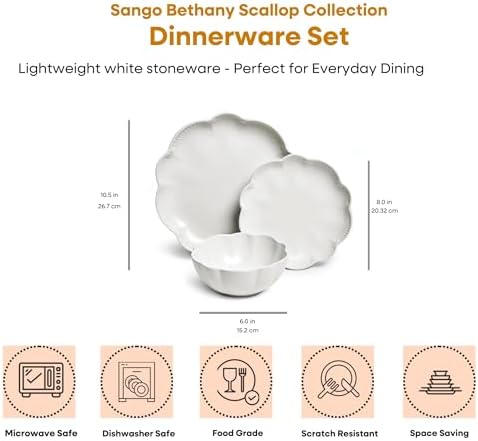 Sango 12 Pieces Scalloped Dinnerware Set, Modern White Dishes for 4, Premium Serving Plates & Bowls Sets, Chip & Scratch Resistant, Ceramic Dishware, Kitchen Dish, Microwave & Dishwasher Safe, Bethany