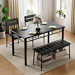 Industrial Modern Style: This 4-piece dining table set combines metal and wood to present straight lines and clean silhouettes for a clean, modern design. Seats 4 people comfortably, perfect for dining room, kitchen, living room Comfortable and Durable: Compared to traditional wooden chairs, our chairs are all equipped with thick cushions to make you sit more comfortably. The support legs of the chairs and table are reinforced to ensure stability and durability Space-saving Design: Designed with practicality in mind, the bench and chairs can be tucked neatly under the table when not in use, maximizing the use of space, perfect for apartments or smaller rooms, keeping the room neat and organized High-quality Construction: This kitchen table set is made of high quality engineered wood and metal frame, the materials are durable and easy to maintain, with excellent stability and strength to ensure long term use Easy to Assemble and Maintain: Comes with clear instructions and necessary accessories, just follow the instructions for easy installation. The small kitchen table surface is smooth and easy to clean, just simply wipe it down