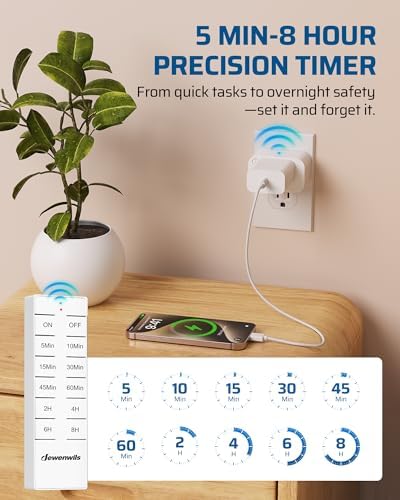 - [Precise Countdown Control] With 8 preset countdown options from 5 minutes to 8 hours, this indoor remote timer outlet allows you to schedule automatic shutoff for lights, fans, coffee makers, and more, perfect for extending the life of your appliances