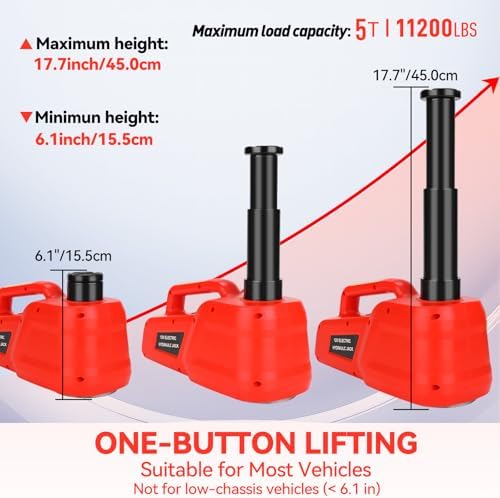 - Auto-Lift Convenience: This electric hydraulic jack removes manual pumping with one-button lifting. Unlike traditional jack stands, our power jack lift vehicles effortlessly in minutes. Overload protection pairs with standard stands for safer tire changes