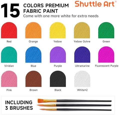 - 14 VIBRANT COLORS PLUS EXTRA WHITE: The Shuttle Art fabric paint set includes 14 vibrant soft fabric paints (12 ml/0.4 oz) in tubes, plus an additional white for extra versatility, along with 3 brushes. Perfect for various textile painting projects and art crafts