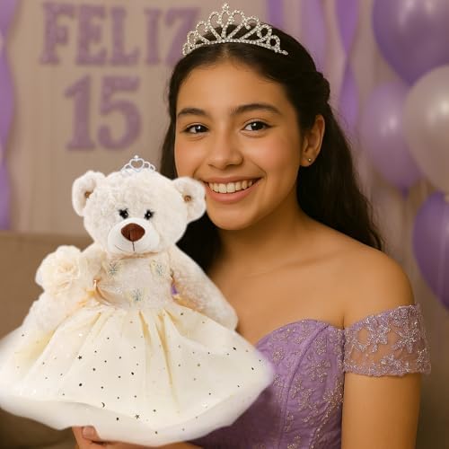 - Package Includes: One beautifully crafted Quinceañera bear dressed in an elegant gown with butterfly embroidery, a stunning queen crown, a pair of stud earrings, and a delicate flower accessory. This complete set adds both charm and sophistication, perfect for enhancing any quinceañera celebration or as a thoughtful keepsake gift.