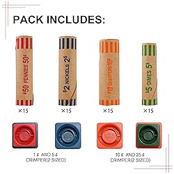 COIN ORGANIZER TOOL SET: You will get 60 coin wrappers and 2 coin crimpers just a one-time order. PRE-FORMED COIN WRAPPERS : ABA standard color coded coin wrappers, 15 Quarters, 15 Pennies, 15 Nickels, 15 Dimes.made of high quality, sturdy paper, and each roll is clearly printed for easy identification, easy to wrap. COLOR CODED COIN CRIMPERS : Color coded crimpers easily crimp coin roll. (Orange = Quarters, Red = Pennies, Blue = Nickles and Green = Dimes),Get the coin in coin wrapper, You place coin crimpers on the end and give a twist. it's much easier crimped look. HIGH-QUALITY MATERIAL: Coin wrappers use kraft 60lb. Paper, it is durable, heavy duty kraft paper wrappers. Coin crimpers is made of durable plastic.All coin accessories conform to ABA Standards Color Coding,so you will have no trouble distinguishing which one goes with which (Orange = Quarters, Red = Pennies, Blue = Nickles and Green = Dimes). APPLICABILITY: Useful tool for banks, stores, cafes and other commercial places. It can also be used as an educational tool to help children identify coins