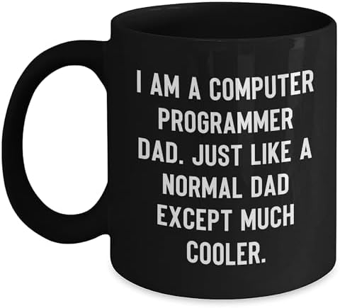 - Show off your love for coding with our funny computer programmer dad black coffee mug, featuring the witty quote 'I Am A Computer Programmer Dad. Just Like A Normal Dad Except Much Cooler.' Perfect for any computer programmer dad in your life.