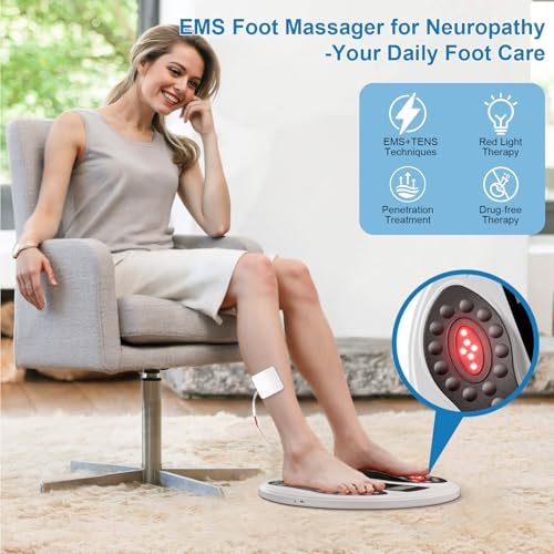 - Multi-Technology Foot Massager: Our New-Generation foot massager for neuropathy combines EMS, TENS, and PBMT therapies to relieve symptoms like neuropathy, plantar fasciitis, arthritis pain, muscle spasms, swelling, and Restless Legs Syndrome (RLS).Equipped with advanced NMES technology, it effectively boosts blood circulation and quickly eases foot pain—especially discomfort caused by neuropathy, chronic strain, and muscle weakness. It also helps reduce fatigue and improve sleep quality.