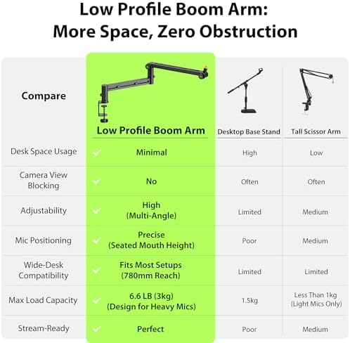 - [Low Profile Mic Arm Under Screen] Unlike bulky high sissor arms or desk stands, this low profile boom arm slides neatly under your monitor, keeping your mic close without blocking your screen or camera. Perfect for streaming, gaming, and video recording, it keeps your setup clean without being an eyesore on screen.