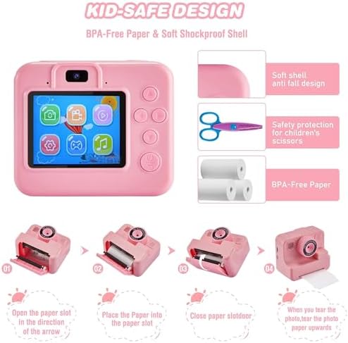 - Safe and reliable: The kids instant print camera adopts advanced thermal printing technology, the printing paper is BPA free, which is safer and more secure. High-quality soft plastic shockproof shell effectively prevents falling. Safe and reliable toys are the most suitable gifts for children