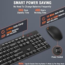 【Type in Comfort & Smooth】 The foldable stand of the keyboard provides two tilt angles, which help relieve wrist pressure and increase comfort. 3mm short keystroke distance, lighter keystroke force, and standard 104 keys full size American QWERTY layout make typing more sensitive, smooth, and soft. 【Less Noise, More Quiet】The mouse is 100% quiet without any clicking sound. The keyboard is not super quiet, but it is more than 95% quieter than other similar keyboards, so you can without worrying about disturbing others. 【Lag-free, Plug & Play】2.4GHz wireless technology provides automatic frequency recognition and stable signal, plug and play, connection range up to 33ft without any delays. Cut the cord and enjoy the freedom.【𝐍ote】Keyboard and mouse share one receiver, which is stored in the mouse. 【Sleep Mode Extends Battery Life】 Idle for 6 mins, the keyboard will sleep, idle for 15 mins, the mouse will sleep, by typing or double clicking any keys to wake. Saving you the trouble of changing batteries frequently. The keyboard needs 2 x AAA batteries, the mouse needs 1 x AA / 1 x AAA battery (𝐁attery 𝐍ot 𝐈ncluded). 【Wide Compatibility】 This wireless keyboard mouse combo is compatible with all Windows system versions, Linux, Chrome OS. Works well with computer, laptop, Chromebook, PC, desktops, TV. 【𝐍ote】𝐓he 𝟏𝟐 shortcuts are not fully compatible with the 𝐌ac system. 【Lifetime Care】Have a free one-year replacement warranty. If you encounter any problems during use, please contact us, we will provide a satisfactory solution.