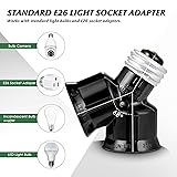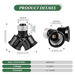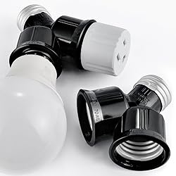 UL LISTED LIGHT SOCKET ADAPTER - Made from quality and safe bakelite material to double the medium socket. It can handle a maximum electricity load of up to 660W / 250V. Suitable for LED bulbs, CFL bulbs, bulb cameras, and incandescent bulbs under 60W. DOUBLE UP THE ILLUMINATION OR ADD A PLUG ADAPTER - To adapt a socket for a plug or a second light bulb. Increase lighting in areas without changing a fixture. Widely used in the garage, the front door, the closet, or floodlight fixtures. APPLICATION - Add extra light bulbs in the garage/storage area; install a light and a security camera in one socket; increase the overall illumination level in the living room; adapt a socket for a plug or second bulb; double the lighting in closet; modify a socket for a plug or a second bulb for an outdoor camera light; make it easier to increase lighting in the garage, basement, and attic fixtures. SPLIT AND EXTEND Standard Medium E26 Light Socket -The adapter splits the light socket into 68 degrees(Par light with a large body couldn't be installed). It also extends the length by 1-1/4 inches. EASY TO INSTALL - Turn off the light, remove the existing bulb, and install the adapter as simply as screwing in a light bulb.