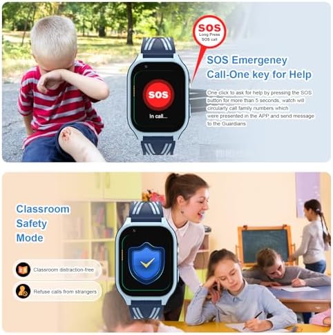 - One Key SOS Button: Our children's gps tracker watch has will make an emergency call to the preset 3 phone numbers, When the child is in danger, they can press the SOS button for 3 seconds and the kids gps tracking smartwatch will automatically circularly call 3 SOS numbers you set for help until someone answers it. The cell phone watch very helpful for kids in emergency situations!