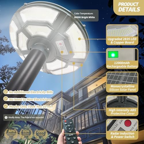 - Smart and Radar Sensing: The solar lamp post light fixture has a radar sensor that adjusts brightness levels and enjoys worry-free operation with automatic functions. The solar lights charge automatically during the day and light automatically at night, and can also be controlled by remote control(within 26-32ft). It glows at 100% full brightness when people approach and preserves energy at 30% brightness when people leave