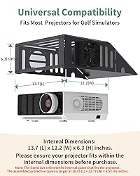 - Elevate your golf simulation experience with our Golf Simulator Projector Cover. Designed for easy floor mounting, this durable enclosure provides robust protection for your LED projectors without the complexity of ceiling installations. Constructed from a heavy-duty steel frame, the cover ensures long-lasting durability while the clear polycarbonate panel keeps your projector safe from accidental impacts. The innovative ventilation system, featuring ports on the top and sides, promotes optimal airflow, preventing overheating during extended use. The included cooling fan can be easily positioned to align with your projector’s exhaust, enhancing heat dissipation and ensuring your projector operates smoothly even during intense gaming sessions. With universal compatibility, this cover fits most popular golf simulator projector models, as long as they stay within the specified dimensions of 15.7(L) x 12.2(W) x 6.3(H) inches. It also incorporates power cord holes, preventing any cable pinching and ensuring a tidy setup. Installation is a breeze, thanks to the comprehensive instruction manual and all necessary tools included in the package. Whether you’re a casual player or a dedicated golfer, our Golf Simulator Projector Cover is the perfect accessory to protect your investment and enhance your gaming experience. Enjoy the game with confidence, knowing your equipment is well-protected!