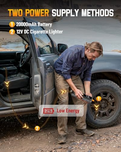 - 【Power That Goes the Distance】Inflate up to 4 tires on a full charge, or plug into your car’s 12V outlet for continuous use. This cordless tire inflator keeps you powered up and prepared—perfect for long drives and unexpected flats.