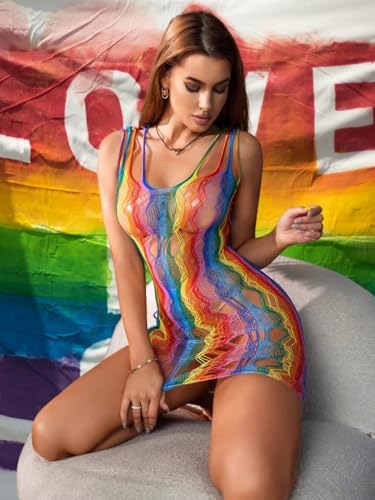 Fishnet Dress Sexy Rave Outfits for Women Sheer Mini Dresses Party Club Night Festival Concert Pride Rainbow,Red/Orange/Yellow/Green/Blue/Purple