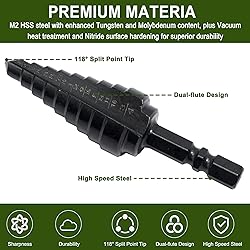 PREMIUM MATERIAL: M2 HSS steel with enhanced Tungsten and Molybdenum content, plus Vacuum heat treatment and Nitride surface hardening for superior durability VISIBLE SIZING: Polished steps with clearly marked sizes from 1/4" to 3/4" allow continuous drilling without stopping to check measurements VERSATILE USE: Effectively cuts through stainless steel (up to 12ga), hardened metal, mild steel, galvanized steel, aluminum, copper, plastic, and wood QUICK CHANGE DESIGN: Features 1/4 inch hex shank for rapid bit changes and compatibility with impact-ready power tools NINE SIZE OPTIONS: Single bit provides 9 different hole sizes: 1/4", 5/16", 3/8", 7/16", 1/2", 9/16", 5/8", 11/16", and 3/4", eliminating the need for multiple bits