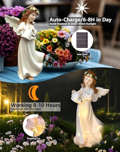 - Angle Garden Statues: The garden angel statue can be charged with solar energy for 6-8 hours and emit light continuously for 8-10 hours at night. Automatic sensing LED lights project warm light and shadow, adding warmth and refinement to outdoor spaces.