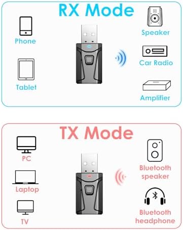 • BLUETOOTH TRANSMITTER RECEIVER: ✅In TX mode, the USB Bluetooth transmitter for TV streams audio from your PC, MP3, TV, etc to Bluetooth headphone or speaker. ✅In RX mode, the aux Bluetooth adapter lets you receive audio from your phone or tablet and play it through non-Bluetooth devices, such as wired speaker, car stereo, home stereo, and more.