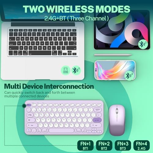 Wireless Keyboard and Mouse, Compact Multi-Device Bluetooth Keyboard and Mouse Combo, Silent Adjustable 2400 DPI, 2.4G+Bluetooth Computer Keyboard for Laptops Mac PC, Chrome OS, Travel (Purple)