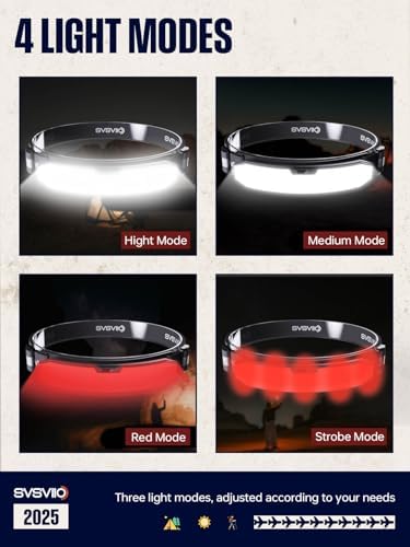 - [Professional IPX4 Waterproof & Risk-Free Purchase]: IPX4 Waterproof: Fully enclosed design keeps out water mist and rain, perfect for any bad weather. Risk-Free Purchase: 180-day quality assurance and 60-day money-back guarantee. Add the SVSVIIO LED headlamp to your cart now for the best lighting experience!