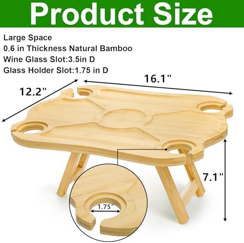 - Our picnic snack table measures 16.1"L x 12.2"W x 7.1"H, giving large room to hold snacks or breads. There are 4 wine glass holders slot with 1.75"D and a spot for the wine bottle with 3.25"D. Great for standard size wine bottle, champagne bottle and glasses. Also the recessed area is specially designed to keep food from rolling off, so you can fully enjoy your outdoor meal without any mess.