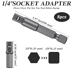 - specificationProduct name: 8-piece set of 1/4 hexagon to 1/4 square socket adaptersMaterial: Chrome vanadium steelProduct size: 4 pieces of hexagon to square 1/4 inch socket bit adapters (total length 25 mm) and 4 pieces of 1/4 inch hexagon to 1/4 inch socket adapters (total length 50 mm)Weight: 86.7gPacking list:4 pieces of hexagon to square 1/4 inch socket bit adapters4 pieces of 1/4 inch hexagon to 1/4 inch socket adapters