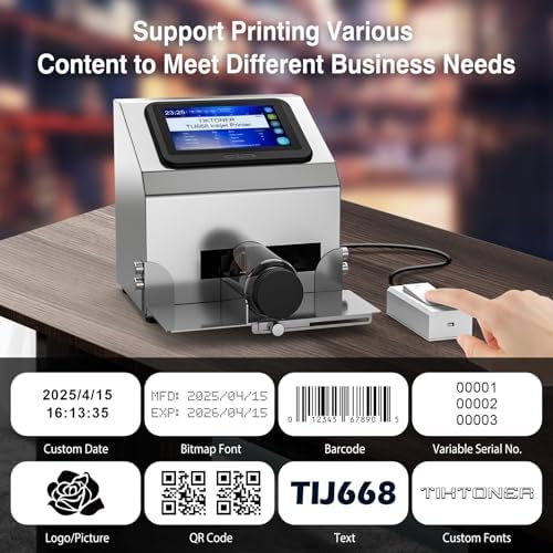 - 【A Variety of Content】TIKTONER date lot batch inkjet coder has built-in multiple fonts and also supports importing fonts (font format ttf). TIKTONER desktop inkjet coding printer can print various information, such as text, serial bacth/lot number, barcode, QRCODE, variable QRCODE, production date, time, expired date, picture(jpg.png.bmp) directly onto a vast array of products and packaging materials.