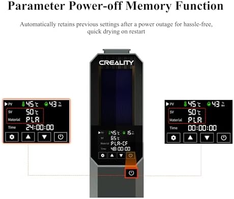 - [LCD Touch Screen]: The Creality filament is equipped with a 3.7-inch touch screen for easy operation, allowing you to easily track drying. Real-time temperature/real-time humidity/drying countdown