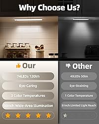 Upgraded Motion Sensor Lights: This rechargeable under cabinet light is equipped with a motion sensor mode. In this mode, the light detects motion within a 10 ft range and a 120° field. It automatically turns on and then switches off after 20 seconds of no movement. Please note that this mode activates only in low-light conditions, making it perfect for late-night use. No more stumbling in the dark trying to find a light switch. 3 Color Temperatures & Adjustable Brightness: These motion sensor closet lights let you choose from Warm (3000K), Warm White (4500K), or White (6500K) lighting to suit any scene. Easily switch color temperatures with a press and adjust brightness from 10%–100% by long-pressing—comfortable lighting for your eyes at any time. Long-Lasting Battery & USB Charging: The motion sensor indoor light is equipped with a 3200 mAh rechargeable battery and can be easily recharged via Type-C. One full charge can last up to 12–41 days in Motion Sensor Mode (depending on how often you use it) and 8–10 hours in Always-On Mode at 100% brightness. Dual Remote Control & Timer Function: These under-cabinet lights come with one remote control for convenient wireless operation. Set the closet lights to always on/off, adjust brightness, change color temperatures, or set a timer (15–120 minutes) to customize lighting duration effortlessly. Easy Installation and Wide Usage: Strong built-in magnets attach securely to metal surfaces, or use the included 3M adhesive plates for tool-free installation. Easy to remove for charging your lights. Great under-counter lights for kitchens, closets, cupboards, pantries, basements, stairs, hallways, bookshelves, etc. 3M Adhesive Usage Guidelines: First, attach the iron plate to the magnetic area on the back of the light fixture with the adhesive side facing up (ensure it is aligned with the magnetic area to prevent it from falling off). Second, peel off the protective film from the double-sided adhesive tape. Third, clean the installation surface and install the light fixture in the desired location (press firmly for 10 seconds), such as under cabinets, on stairs, in corridors, on bookshelves, and other locations.