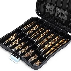 99 Pcs Combination Set: this set contains 230 twist drill bits of varying sizes from 1/64''-25/64''; It caters to a wide range of drilling needs and comes in a 7.87 x 7.64 x 1.42 inches/ 20 x 19.4 x 3.6 cm plastic box for easy storage and transportation Sharp Wear Resistant Material: HSS titanium alloy micro drill bits are made of industrial grade high speed steel, with high strength and good durability; The titanium coating on the surface prevents rust and increases wear resistance Fully Ground Process: the fully ground spiral groove design makes the drill bit surface smoother, which can easily remove debris and particles, reduce friction, and achieve faster drilling performance 135° Split Point and Twist Design: the 135° fast cutting point increases the cutting speed and has self-centering ability, making drilling precise and preventing walking and sliding on the workpiece surface Wide Application: the titanium plated industrial grade is suitable for lithium electric drills, hand drills, impact drills, etc. Including all common size specifications for wood/cast iron/aluminum alloy/mild steel/soft metal/plastic/fiberglass, etc
