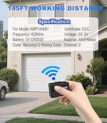 🚔【 Compatible Garage Door Remote 】the remote transmitter for ghost controls is fully compatible with both your AXP1 AXS1 models. NOTE: Please confirm whether you are a commercial door system before placing an order.Upgraded 3-button remote control transmitter for automatic gate openers. 🚔【 Easy Installation and Wide Remote Control】The AXS1 Remote Transmitter comes with a pre-installed battery and a visor clip for quick mounting in your vehicle. Press TEST to check the battery. Beeping means it's low.The remote transmitter provides reliable signal transmission, allowing you to operate your door opening system with easy. 🚔【 3-Button Operation】The AXS1 Remote Transmitter features a user-friendly 3-button layout to control up to three devices. Each button on this 3-Button Remote Transmitter sends a unique, secure code. 🚔【Easy to Programming】The Remote Transmitter includes simple instructions for adding or removing devices—no tools required for setup. 🚔【Package and Service】This remote replacement comes with batteries, visor clip, user manual included. It is fully installed and is pre-tested to ensure quality and superb performance functionality. (If you have any further questions or problems during the programming process, you can contact us at any time, we will be the first time to provide you with a detailed answer until you solve the problem.)