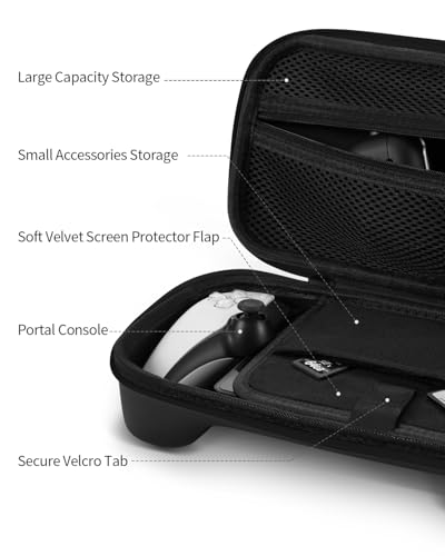 - FULL PROTECTION: The hard shell of the ps5 portal case is made of PU material, which is impact-resistant and water-resistant. The soft velvet divider protects the screen from scratches effectively. Velcro straps keeping controller securely in place