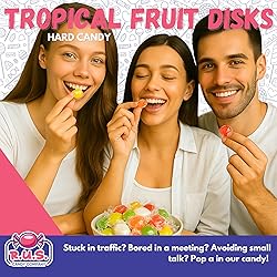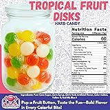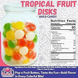 - Indulge in the vibrant burst of fruity goodness with our Tropical Fruit Disk Hard Candy! This 1-pound bulk bag is packed with individually wrapped, vividly colored candy disks offering a medley of tropical fruit flavors that will transport your taste buds to paradise. Perfect for offices, party favors, candy jars, and waiting rooms, these timeless sweets are a crowd-pleaser for all ages. Each piece is wrapped for ultimate freshness and hygiene, making them perfect for on-the-go snacking, party buffets, or sharing with friends and family. Whether you're stocking up your breakroom, planning a celebration, or just need a sweet pick-me-up, this bulk fruit hard candy delivers flavor, fun, and value in every bite!